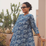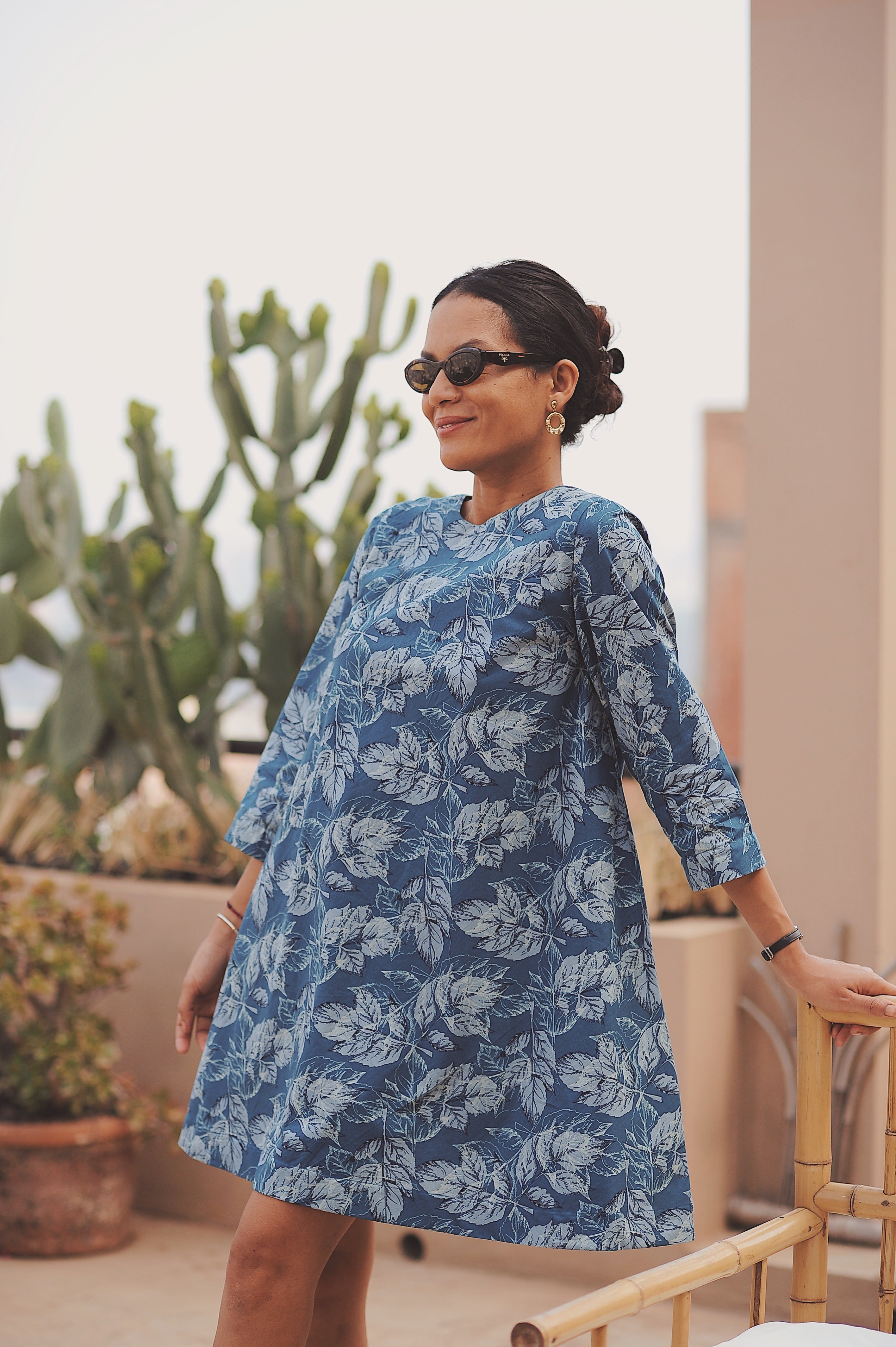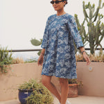 - Robe courte bleue imprimé feuilletage blanc